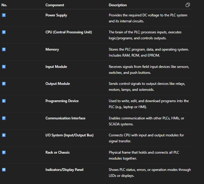 The **PLC architecture** includes several **parts of a PLC** that work together seamlessly. The **PLC CPU** acts as the brain, processing data and executing logic. The **PLC I/O modules** connect sensors and actuators, translating **analog and digital signals** into meaningful data. The **PLC power supply** converts electrical energy for system use, while the **PLC rack** holds and organizes the different modules